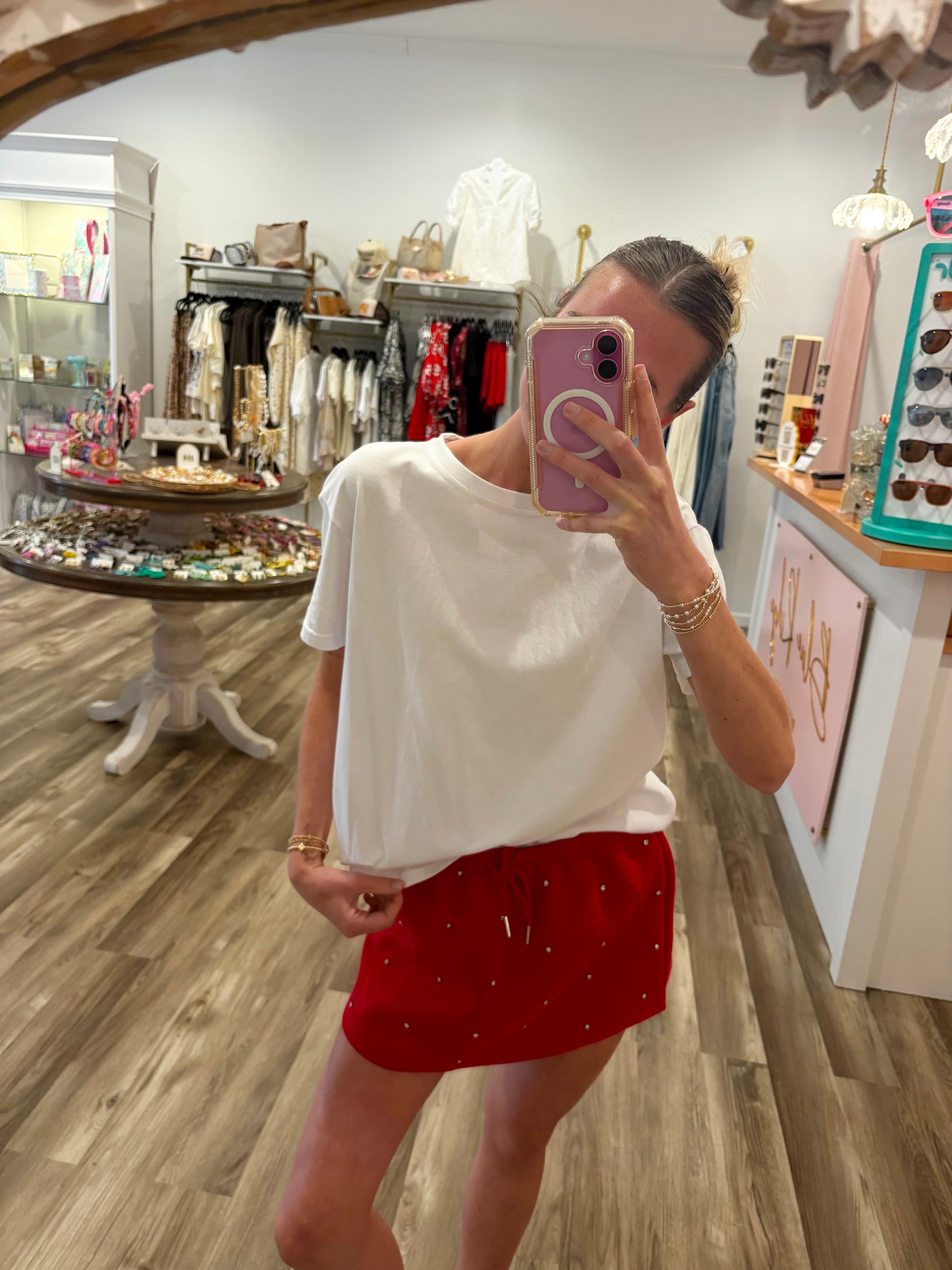 EMBELLISHED SCUBA MINI SKIRT FABRIC: SCUBA 52% POLYESTER 48% COTTON ** LONG SLEEVE WITH EMBELLISHED SCUBA POLO TOP: Please search SKU# T14880 - new arrivals, active basic, active usa, matching set, soft scuba, polo, stud, crystal, mini skirt, A-line, drawstring, trending, must have, essential