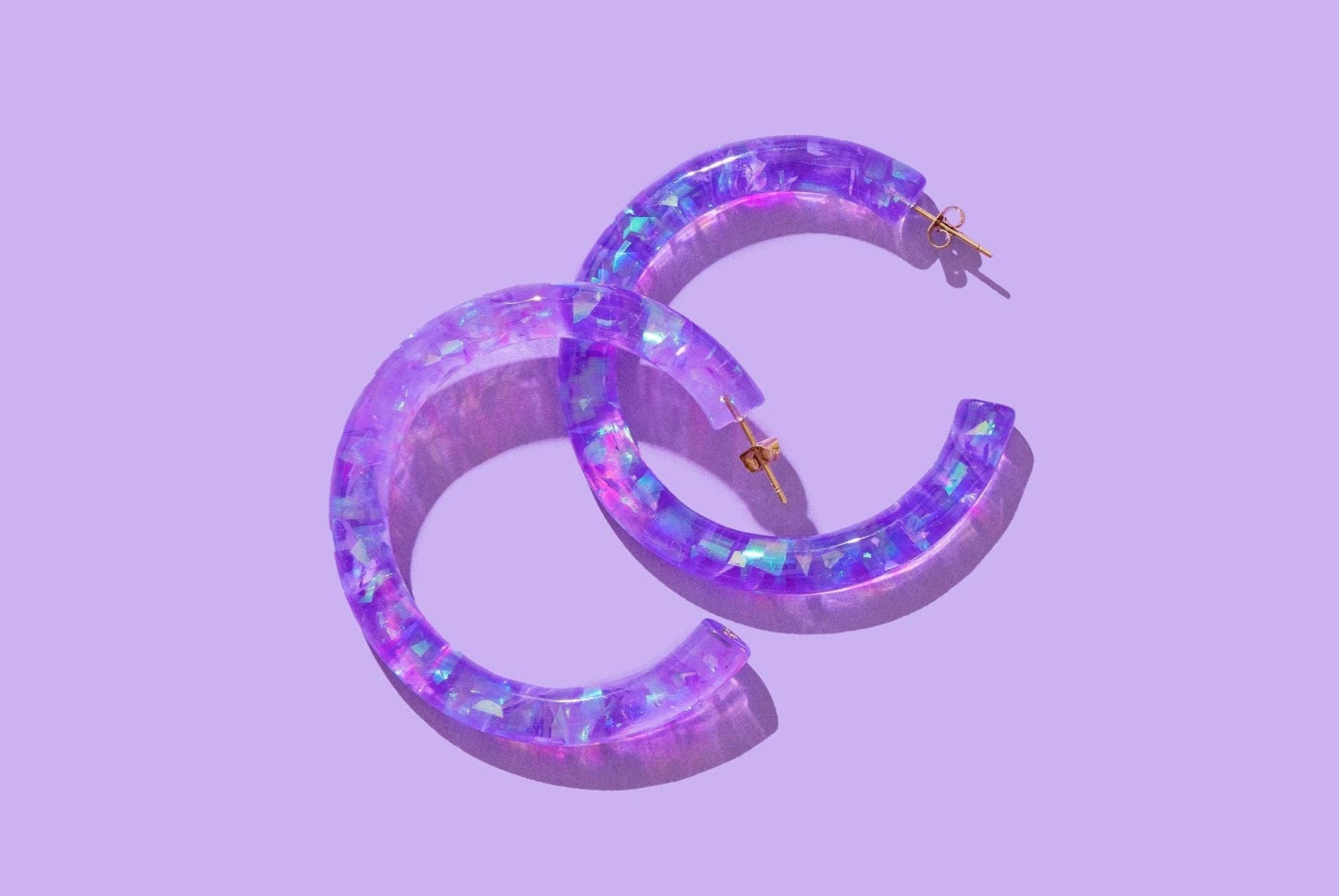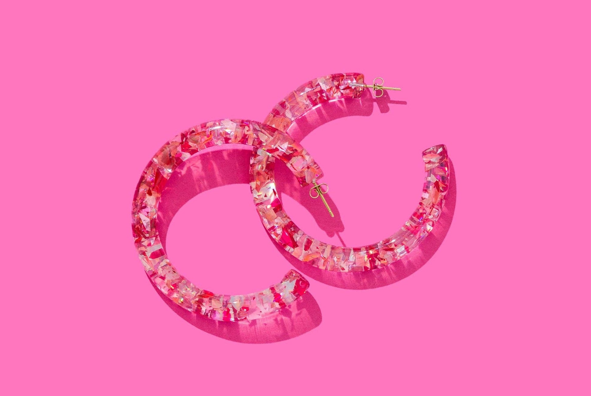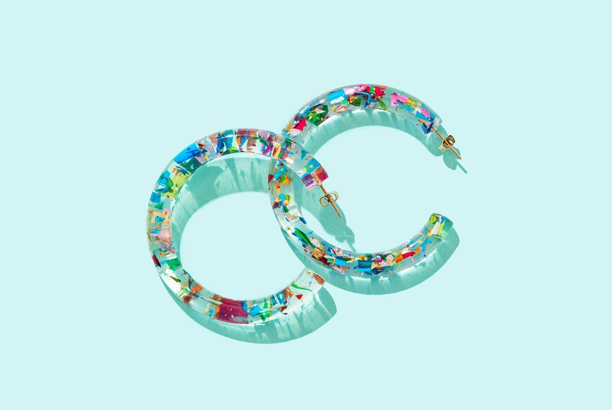 *Each confetti piece is meticulously hand-sprinkled into the resin, ensuring a no-shedding experience. Thanks to this distinctive process, each hoop becomes a one-of-a-kind masterpiece, making every piece as unique as the individual you're gifting it to. Details * 32 pairs of earrings * 1 display * Earring size: 2.125" diameter * Display size: 9.25" x 8" x 2" * Confetti-filled resin hoop * 18k gold plated posts and pins * Surgical stainless steel * Hypoallergenic * Lightweight * Nickel and lead free *